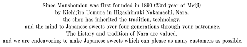 Since Manshoudou was first founded in 1890 (23rd year of Meiji) by Kichijiro Uemura in Higashimuki Nakamachi, Nara, the shop has inherited the tradition, technology, and the mind to Japanese sweets over four generations through your patronage.