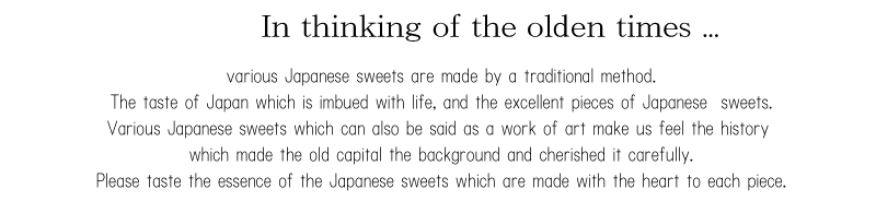 various Japanese sweets are made by a traditional method. The taste of Japan which is imbued with life and the excellent pieces of Japanese sweets. Various Japanese sweets which can also be said as a work of art make us feel the history which made the old capital the background and cherished it carefully. Please taste the essence of the Japanese sweets which are made with the heart to each piece.