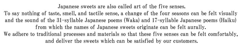 We adhere to traditional processes and materials so that these five senses can be felt comfortably, and deliver the sweets which can be satisfied by our customers.